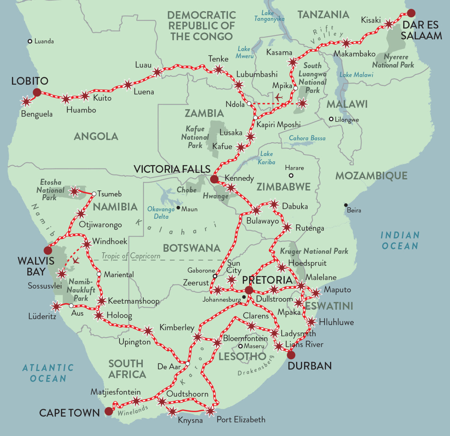 Rovos Raililla on lisäksi myös lukuisia muita reittejä kuten alla oleva kartta esittää.